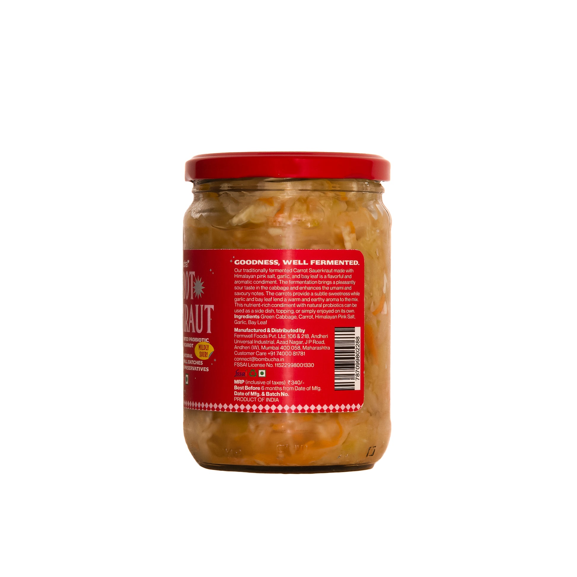 Traditionally fermented, carrot sauerkraut is made with finely sliced cabbage and carrot. The beautiful process of lacto-fermentation brings a distinctive sour taste in the cabbage after breaking down the naturally occurring sugars. We add juniper berries and caraway for the additional savour, giving you a probiotic food that is both healthy and palatable. Sauerkraut offers nutrition and health benefits far beyond those of fresh cabbage.