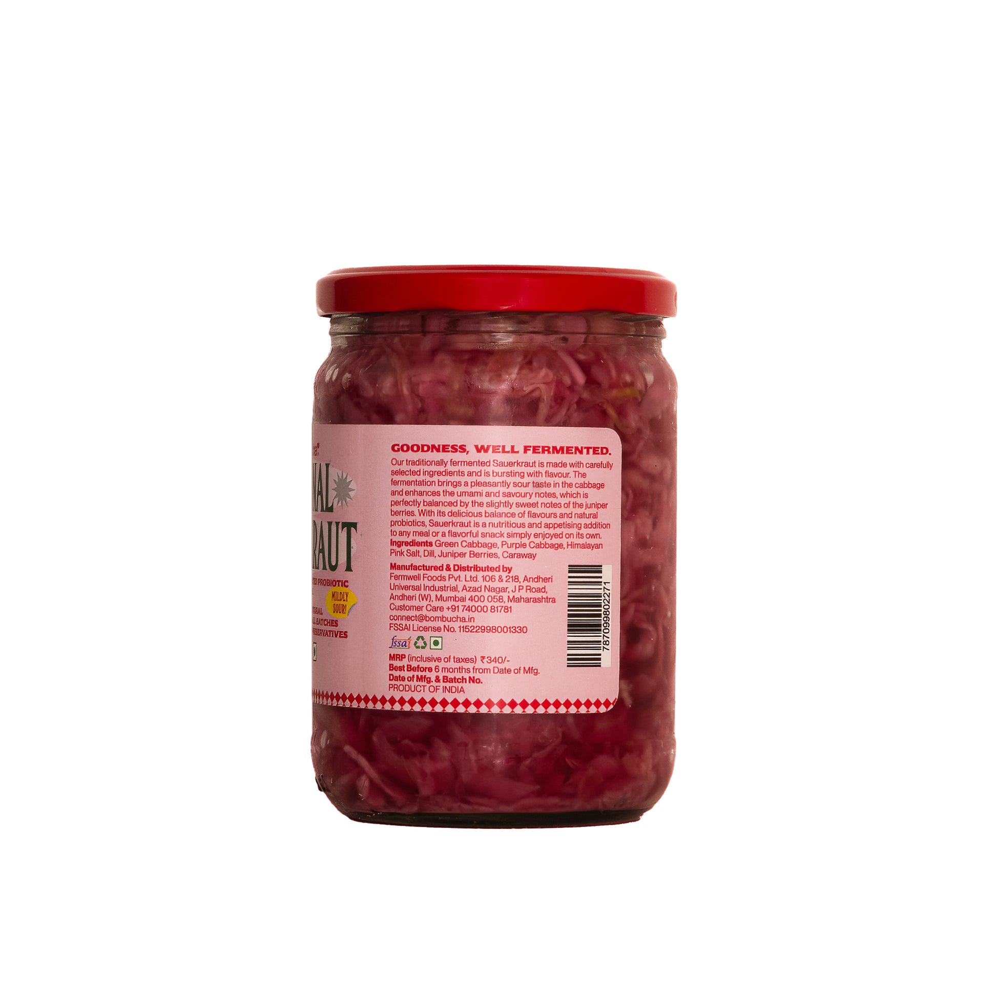 Traditionally fermented, original sauerkraut is made with finely sliced green and purple cabbage. The beautiful process of lacto-fermentation brings a distinctive sour taste in the cabbage after breaking down the naturally occurring sugars. We add dill, juniper berries and caraway for the additional savour, giving you a probiotic food that is both healthy and palatable. Sauerkraut offers nutrition and health benefits far beyond those of fresh cabbage.